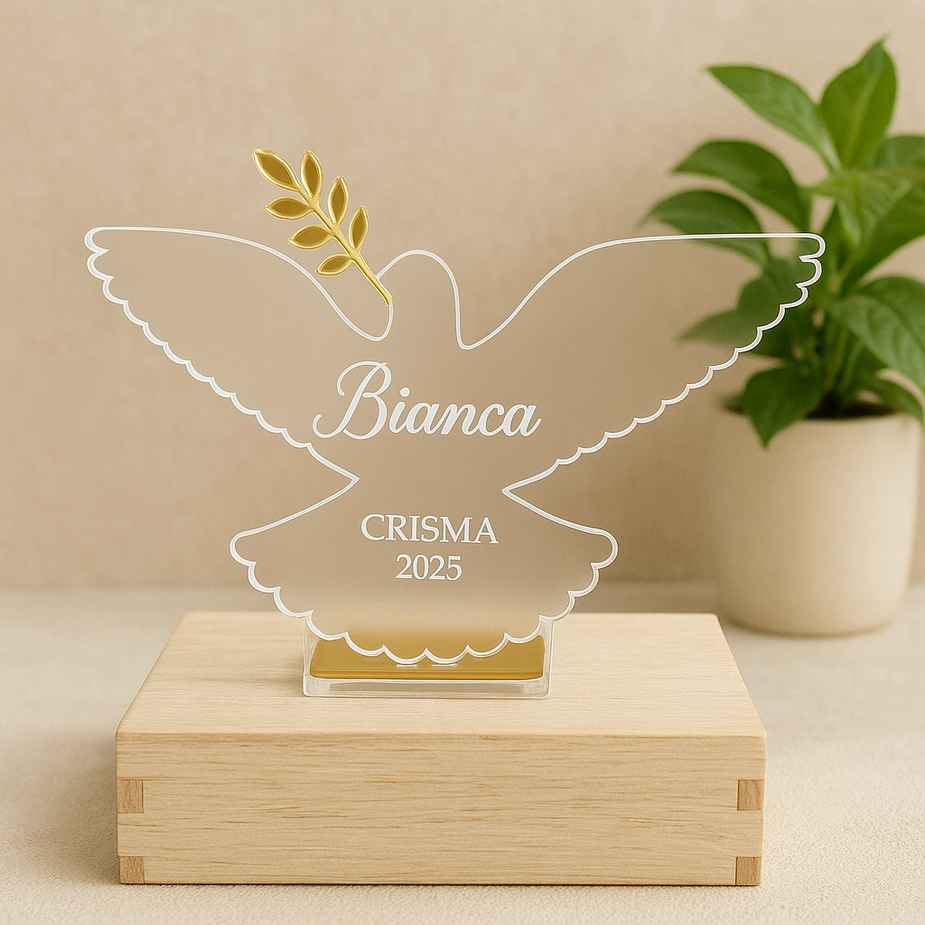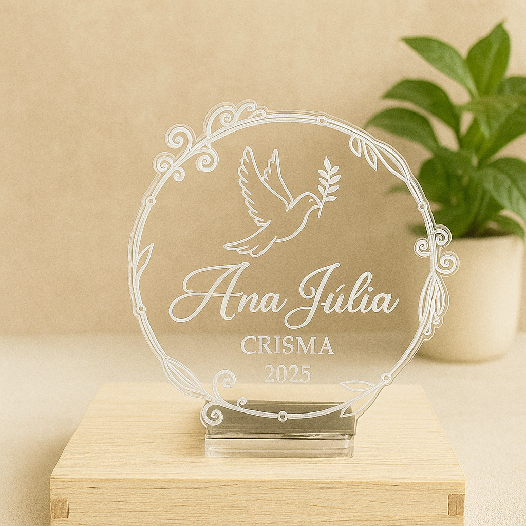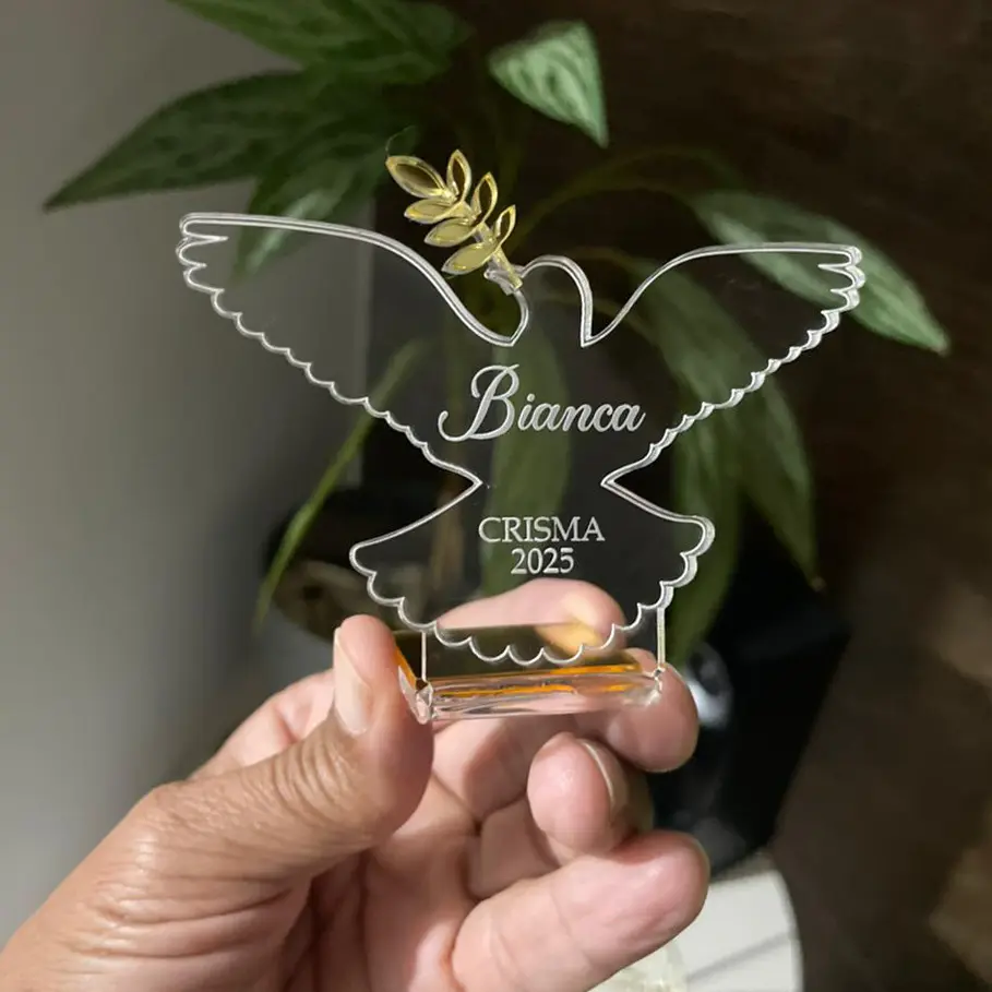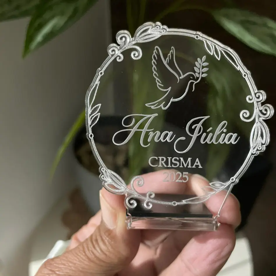 Lembrancinha ideal para Crisma, Eucaristia ou Batizado. Com detalhes originais e encantadores. Personalizado com gravação a laser com nome, evento e ano.